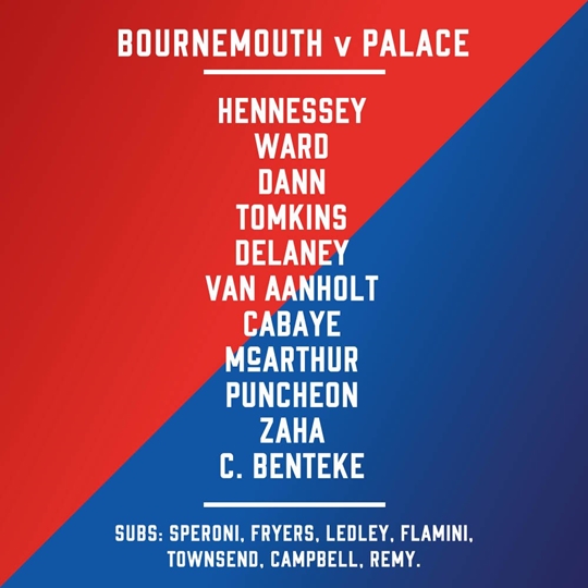 크리스탈팰리스는 벤테케, 자하, 펀천, 멕아더, 카바예, 반 안홀트, 델라니, 워드, 단, 톰킨스가 선발로 출전한다. 골문은 웨인 헤네시가 지킨다.