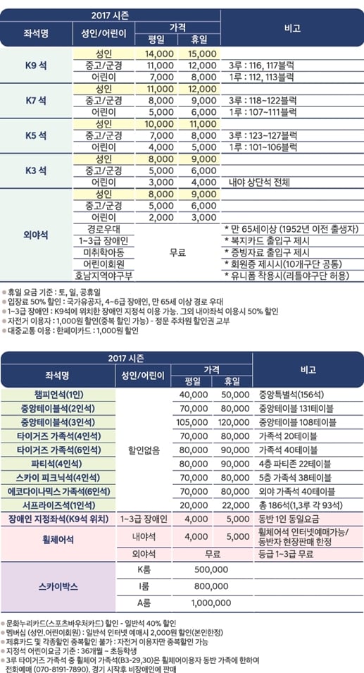 메이저리그식 프리미엄 의자로 전면 교체돼 호평을 얻은 챔피언석은 4만원(휴일 5만원)이다. 가족과 친구, 연인이 편안하게 관전할 수 있는 중앙테이블 2인석은 평일 7만원(휴일 8만원)으로 지난해와 같다. 중앙테이블 3인석은 평일 10만5천원(휴일 12만원)이다.