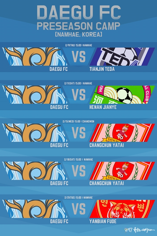이번 2차 국내 전지훈련에서는 텐진 터다, 허난 젠예, 창춘 야타이, 옌볜 푸더 와의 연습 경기가 예정돼 있다. 4팀 모두 중국 슈퍼리그에 소속된 팀이다. 대구로서는 클래식 개막을 앞두고 실전 감각을 쌓을 좋은 기회가 될 예정.
