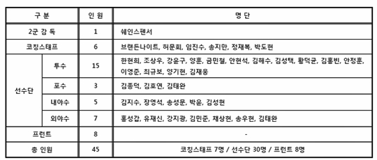 쉐인 스펜서 2군 감독을 포함해 선수단 및 프런트 총 45명이 참가하는 이번 대만 전지훈련은 기본기 중심의 훈련을 통해 성장 가능성이 있는 유망주를 발굴하고 육성하는데 초점을 맞출 예정이다.