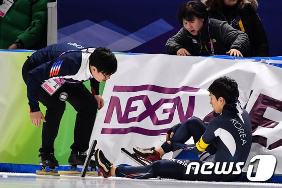 팀추월 경기 중 넘어진 이승훈. /사진=뉴스1
