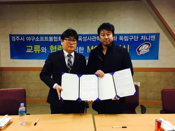 최익성 대표가 이끄는 독립야구단 저니맨 외인구단이 경주시야구소프트볼협회와 업무협약을 체결했다.