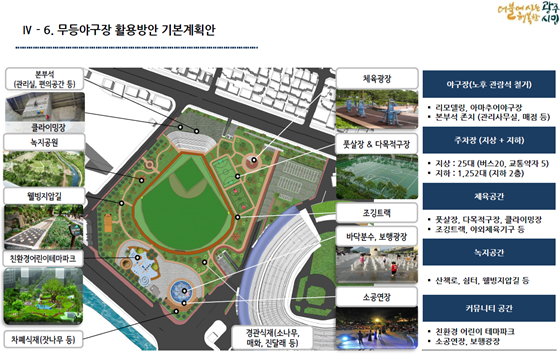 그렇게 나온 최종안에 따르면 본부석은 관리실과 함께 각종 편의시설및 클라이밍장으로 활용되고 야구장 지하에 2층 규모(1,252면)의 주차장이 건설된다. 내외야 관람석을 철거한 공간과 경기장 주변에는 풋살장, 다목적구장, 조깅트랙, 야외체육기구 등을 갖춘 체육공간이 마련되며 웰빙지압길, 산책로, 쉼터, 친환경 어린이 테마파크, 보행광장, 바닥분수, 작은 공연 등을 할 수 있는 소공연장도 조성된다. 아울러 지상에 조성되는 녹지와 각종 체육공간 등은 시민을 위한 개방형 공원으로 제공된다.