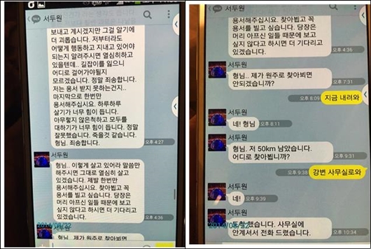 공개된 서두원과의 대화내용에 따르면 서두원은 "마지막으로 한 번만 용서해달라. 하루하루 살기가 너무 힘들다. 죽을 것 같다. 형님 죄송합니다"고 사죄했다.