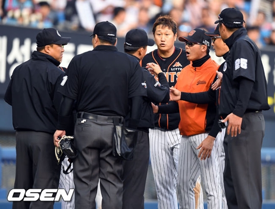 문동균 구심으로부터 아웃 판정이 내려지자 이대호가 다소 격앙된 표정을 보이며 항의했다. 파울이라는 뜻이었다. 이내 조원우 감독까지 더그아웃에서 달려 나와 심판진에 항의를 했다. 그러나 한 번 내려진 판정은 번복되지 않았다. 또 내야 타구의 페어 / 파울 판정은 비디오 판독 대상도 아니었다.