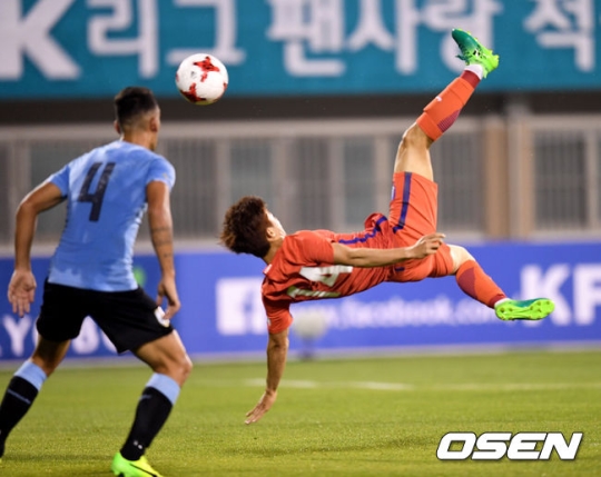 이날 한국은 전반 38분 이승우가 다이빙 헤더 선제골을 터트리며 기선 제압에 성공했다. 그리고 후반 추가시간 4분. 앞서 후반 39분 교체 투입된 강지훈이 문전에서 대기하고 있엇다. 이어 오른쪽에서 하승운(19,연세대)이 올린 크로스를 문전에 있던 강지훈이 힘껏 뛰어오른 뒤 시저스 킥으로 연결, 상대 골망을 흔들었다.
