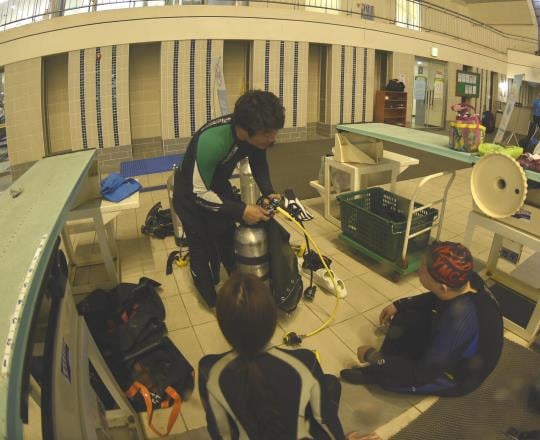 BCD(부력조절장치) 호흡기(레귤레이터) 슈트, 핀, 마스크, 웨이트밸트, 공기통, 스노클을 조립해 다이빙을 활수 있도록 준비한다. 이때 가장 중요한 것은 생명을 담보해야 하기 때문에 안전이다. 버디(다이빙을 같이 할 짝)간 B(BCD)-W(웨이트벨트)-R(해체장치)-A(공기)-F(파이널오케이) 순으로 안전점검을 실시한다.