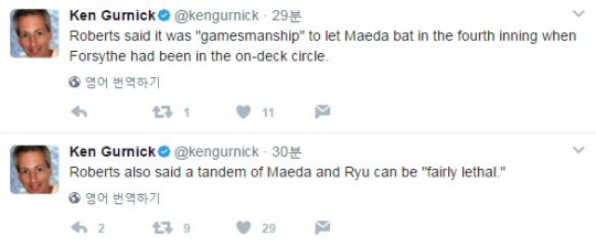 로버츠 감독은 마에다의 타격을 높이 평가하기도 했다. 마에다는 2-3으로 뒤진 4회말 2타점 적시타를 때려내면서 팀에 역전 득점을 안겼다. 켄 거닉 기자에 따르면 로버츠 감독은 "포사이드가 다음 대기 타석에 있을 때 나온 4회 마에다의 타격이 경기를 유리하게 이끌었다"고 평했다.