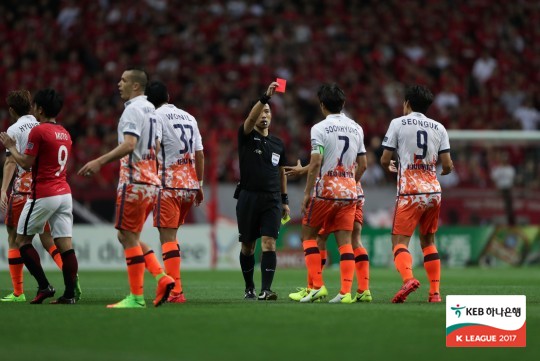 후반 19분 제주는 황일수를 빼는 대신 진성욱을 교체로 넣는 첫 번째 교체 카드를 썼다. 우라와 역시 후반 25분 이충성 대신 아오키를, 후반 31분 코마이 대신 타카기를 투입하며 공세를 더욱 강화했다. 설상가상, 제주는 전반 36분 악재를 맞이했다. 조용형이 역습을 차단하려다가 백태클을 시도, 경고 누적으로 퇴장을 당한 것이다.