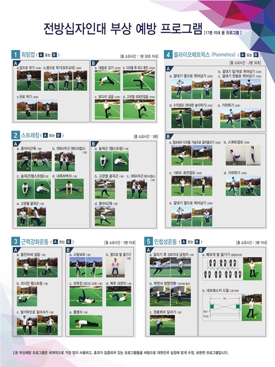 김세준 전문의는 "부상예방의 핵심은 숙련될 때까지 정확한 동작을 주 2~3회 반복하는 것으로서, 6~8주 이상 지속적으로 훈련하면 부상예방 효과를 기대할 수 있다. 숙련된 뒤에도 운동을 중지하면 다시 부상예방 효과는 사라지게 된다"라고 설명하며, 꾸준한 예방운동을 강조했다.