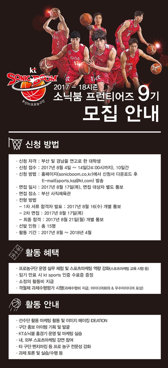부산 KT 소닉붐 프로농구단이 2017-2018시즌 동안 활동할 '소닉붐 9기 프런티어즈'를 공개 모집한다.