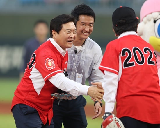 16일 두산-롯데전이 열린 부산 사직야구장에서 롯데그룹의 부산 오페라하우스 1000억원 기부 전달식이 있었다. 시투자 소진세 롯데그룹 사회공헌위원장이 1000억원을 의미하는 등번호 1000의 유니폼을 입고 시구했고 서병수 부산광역시장이 오페라하우스 개관년도인 2021년을 등번호로 새긴 유니폼을 입고 시포했다./사진= 롯데자이언츠 제공
