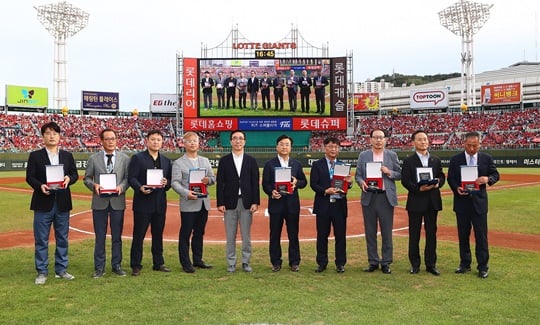 지역사회 발전을 위해 함께 노력을 기울이고 있는 후원사에 감사의 마음을 전하기 위해 마련한 감사패 증정식은 경기 전 그라운드에서 진행했으며 롯데 자이언츠 김창락 대표이사가 이날 참석한 13개 후원사 대표에게 전달했다.