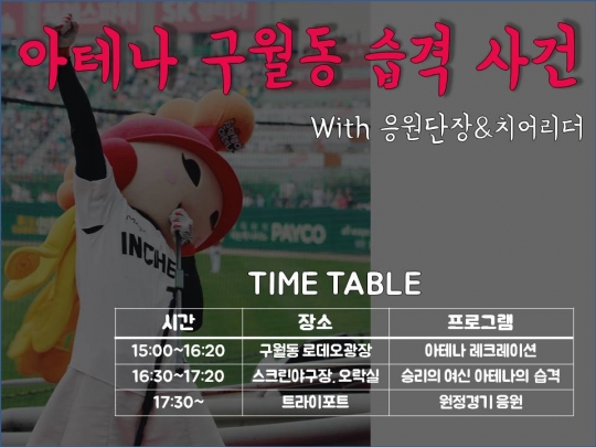 SK는 30일 대전 한화전 원정경기를 맞아 팀의 포스트시즌 진출을 기원하는 '구월동 습격 사건' 이벤트를 마련했다. SK 마스코트 아테나를 비롯해 응원단이 거리 응원을 준비한 것.