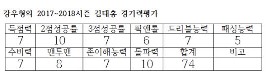 김태홍은 이번 시즌 4경기에서 평균 25분 37초를 뛰며 평균 9.25점 4.5리바운드를 기록하고 있다. 득점력에서는 안정적이라고 할 수 있다. 삼점슛의 정밀도를 조금 더 높인다면 더 많은 시간을 플로어에 나설 수 있다.