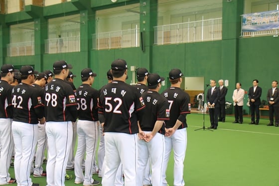 오쿠라가하마 야구장 실내훈련장에서 진행된 환영행사에는 토야 코우헤이 시장을 비롯한 휴가시(市) 관계자, 김진욱 감독을 비롯한 kt wiz 마무리캠프 선수단이 참석했다.