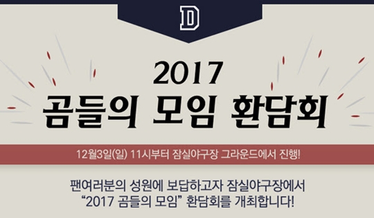 두산베어스가 오는 12월 3일 오전 11시부터 잠실야구장에서 '2017 곰들의 모임' 환담회를 연다.