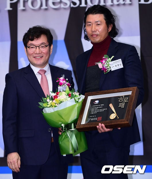 7일 낮 12시 서울 양재동 L-타워 7층 그랜드홀에서 열린 '2017 레전드 야구존 한국프로야구 은퇴선수의 날'에서 시상식이 진행됐다. 어우홍 야구 원로와 최향남 감독은 공로패를 전달받았다.