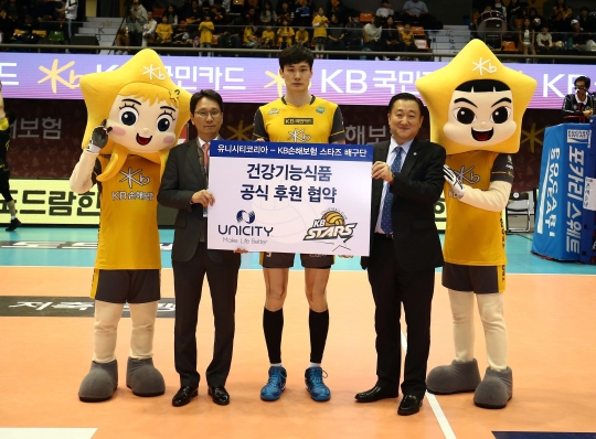 유니시티코리아가 KB손해보험 스타즈 배구단에 건강기능식품들을 후원한다.