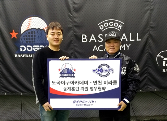 연천미라클은 5일 공식자료를 통해 "연천미라클 김인식 감독과 도곡야구아카데미의 윤정호 대표이사가 강남구 도곡동 도곡야구아카데미 본점에서 연천미라클 동계 훈련장소 지원 협약을 체결했다"고 밝혔다.