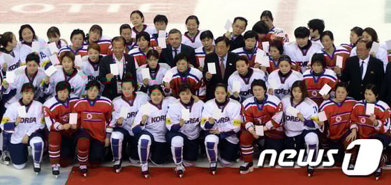 지난 2017년 4월 강원 강릉하키센터에서 열린 남북 대결 이후 기념촬영을 하는 남북 여자 아이스하키 대표팀 /사진=뉴스1