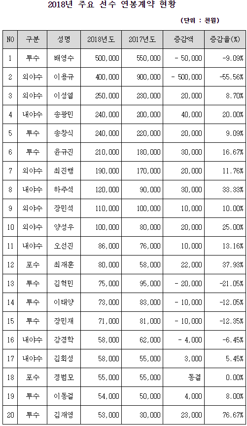 이 밖에도 이성열이 전년대비 8.7% 오른 2억 5000만 원, 송광민이 20% 오른 2억 4000만 원에 계약했다.