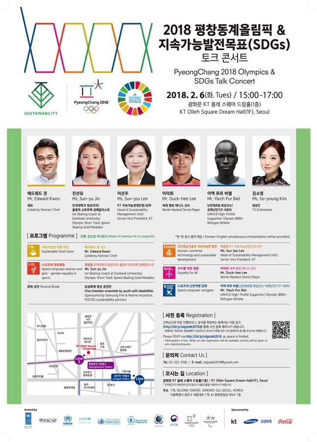 공동캠페인에 참여하는 UN 기관들을 대표로 유엔개발계획 서울정책센터 발라즈 호르바트 소장은 "평창동계올림픽을 계기로 열리는 토크 콘서트를 통해 한국의 젊은 세대가 지속가능발전목표 달성을 위해 함께 노력하기를 진심으로 희망한다"라고 말했다.