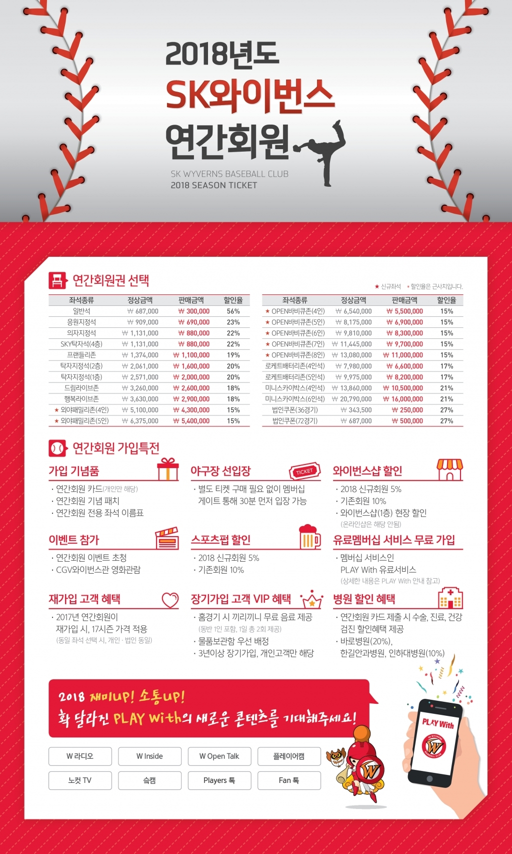 이밖에 2018시즌 모든 연간회원은 연간회원 카드, 구단 공식 애플리케이션인 'PLAY With' 유료멤버십 서비스 무료가입, 야구장 선입장, 와이번스샵 할인(18시즌 신규 5%, 재가입 고객 10%), 제휴 병원(한길안과병원 10%, 인하대병원 10%, 바로병원 20%) 수술∙진료∙건강검진 할인혜택, 시범경기 초청권 등이 제공된다.