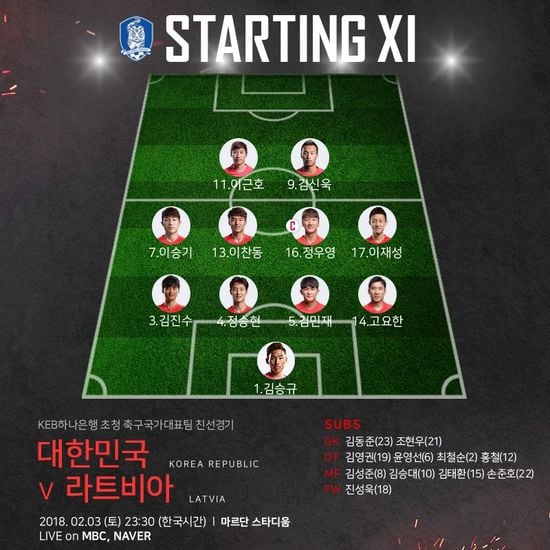 신태용 감독이 이끄는 축구 대표팀(FIFA 랭킹 59위)은 터키 안탈리아 마르단 스타디움에서 FIFA 랭킹 131위 라트비아와 평가전을 치른다.