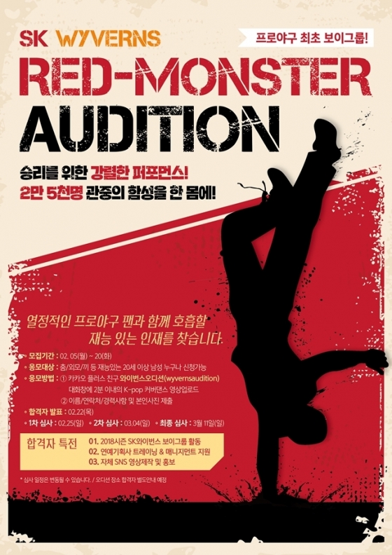 이에 SK와이번스는 5일부터 오는 20일까지 레드 몬스터 멤버를 모집한다. 총 3차에 걸친 심층 공개 오디션을 통해 오는 3월 12일까지 6인의 멤버를 최종 선발하며, 참가자들의 오디션 및 연습과정은 구단 SNS와 포털 사이트를 통해 사전 공개된다.