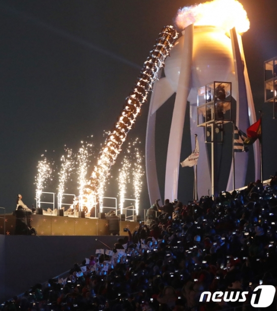 김연아는 성화대 '달항아리' 아래에서 불을 붙였다. 이 불은 달항아리까지 연결된 고리 모양의 구조물을 타고 서서히 올라갔고, 성화대까지 도달했다. 대회를 밝힐 성화 점화가 완료된 것이다. 성화 점화와 이어진 공연을 마지막으로 이날 개회식이 모두 마무리됐다.