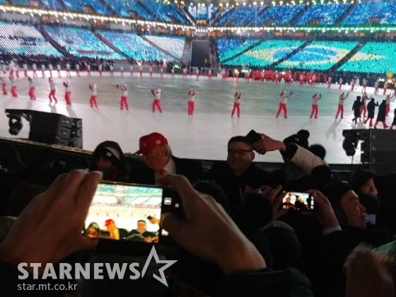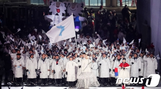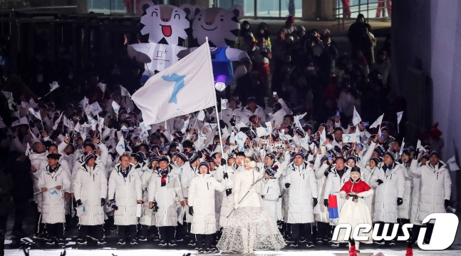 선수단 입장 마지막은 '남북 공동 입장'이었다. 입장을 위해 도열하는 순간부터 환호가 커지기 시작했고, 입장이 시작되자 함성과 박스는 더 커졌다. 외신 기자들도 박수를 치는 모습이 보였다.