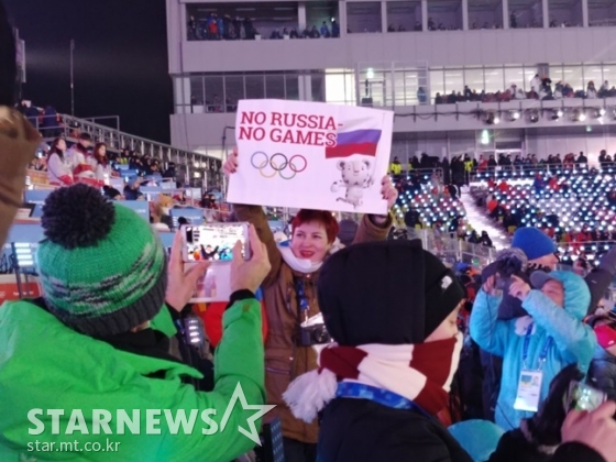 러시아 기자의 작은 '항의'도 있었다. 한 여성 러시아 기자는 'NO RUSSIA NO GAMES'라고 쓰인 피켓을 들었다.