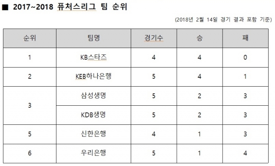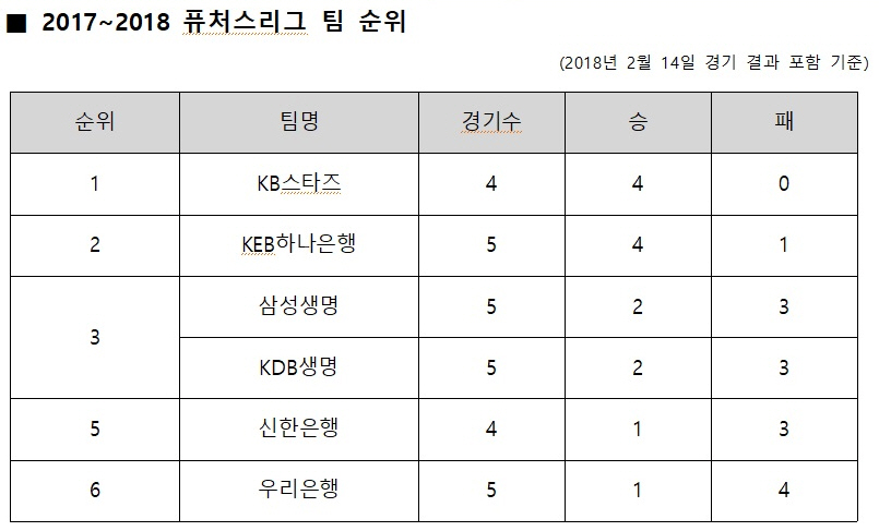KB스타즈는 14일 청주 실내체육관에서 펼쳐진 우리은행과의 퓨처스리그 경기에서 김현아(18득점, 6어시스트)와 김진영(15득점, 16리바운드)의 활약 속에 78 대 56으로 승리했다. 이날 승리로 4승(무패)를 기록한 KB스타즈는 남은 잔여 한 경기 결과에 관계없이 2위 KEB하나은행(4승 1패)을 따돌리고 2014~2015시즌 이후 3년 만에 퓨처스리그 우승을 확정지었다.