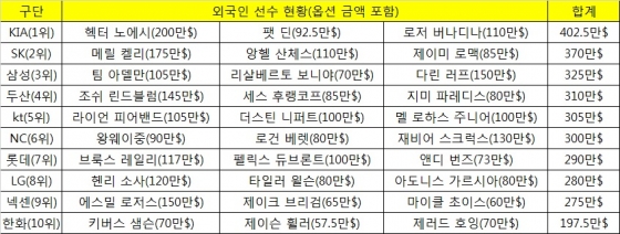 이미 KBO 리그에서 검증된 외국인 선수에게는 확실히 챙겨주는 대신 새로운 외국인 선수와는 비교적 적은 금액으로 계약을 맺었다. 지난 시즌 처음으로 KBO 무대를 밟은 알렉시 오간도(전 한화)와 제프 맨쉽(전 NC)이 180만 달러라는 거금을 받았지만 아쉽게 그만한 값어치를 해내지 못하며 재계약에 실패했다.