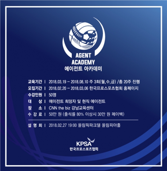 20일 한국프로스포츠협회에 따르면 3월 19일부터 약 5개월간 운영되는 에이전트 아카데미는 에이전트 업무 관련 교육뿐 아니라 스포츠 산업 전반에 대한 이해를 통해 야구, 축구 전문 에이전트를 육성하는 교육 프로그램이다.