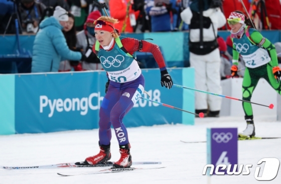 한국은 22일 평창 알펜시아 바이애슬론센터에서 열린 바이애슬론 여자 계주 4x6km에서 1시간 20분 20초6의 기록으로 18개 출전국 가운데 최하위로 결승선을 통과했다.