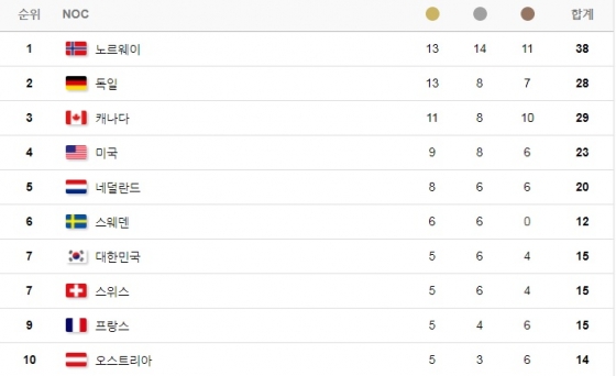 독일은 노르웨이와 금메달 13개로 같지만, 은메달이 8개, 동메달이 7개에 그치며 간발의 차이로 2위를 달리고 있다. 금 11, 은 8, 동 10개의 캐나다가 3위를 그대로 유지했다.