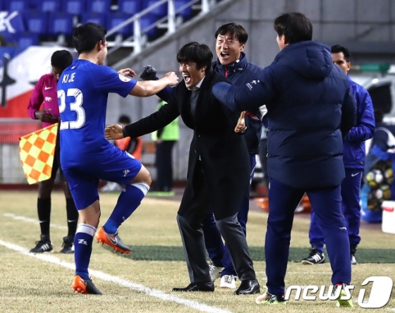 수원 서정원 감독(왼쪽에서 두 번째)이 이기제의 선제골이 터지자 환호하고 있다 /사진=뉴스1