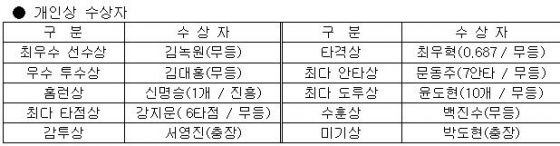 이와 함께 이번 대회 최우수 선수로 선정된 무등중 김녹원 군에게는 트로피와 상장이 주어졌으며 각 부문별 수상자에게도 트로피와 다양한 야구용품이 부상으로 주어졌다.