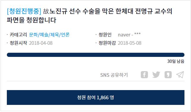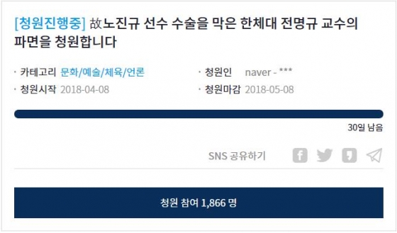 글쓴이는 "故 노진규 선수가 종양이 있음에도 스케이트 출전을 요구한 한체대 전명규 교수의 파면을 요청한다"며 "국립대 교수가 본인의 영달을 위해 선수의 생명을 내다 버렸다. 이런 사람에게 국민의 세금이 들어갈 수 없다. 한체대 교수이자 빙상연맹 부회장인 전명규 교수의 교수직 파면을 요청하는 바이라고 주장했다.