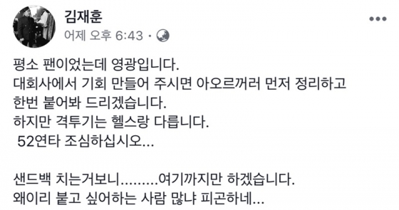 김재훈 역시 SNS를 통해 "평소 팬이었는데 영광이다. 대회사에서 기회를 만들어 주시면 아오르꺼러(23·중국) 먼저 정리하고 붙어봐 드리겠다. 하지만 격투기는 헬스와는 다르다. 52연타 조심해라"라며 도전을 받아주겠다는 뜻을 밝혔다.