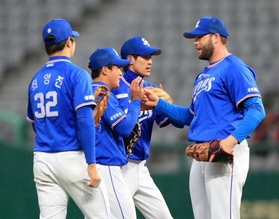 8일 SK전 대승을 자축하는 삼성 선수들 /사진=삼성 라이온즈 제공