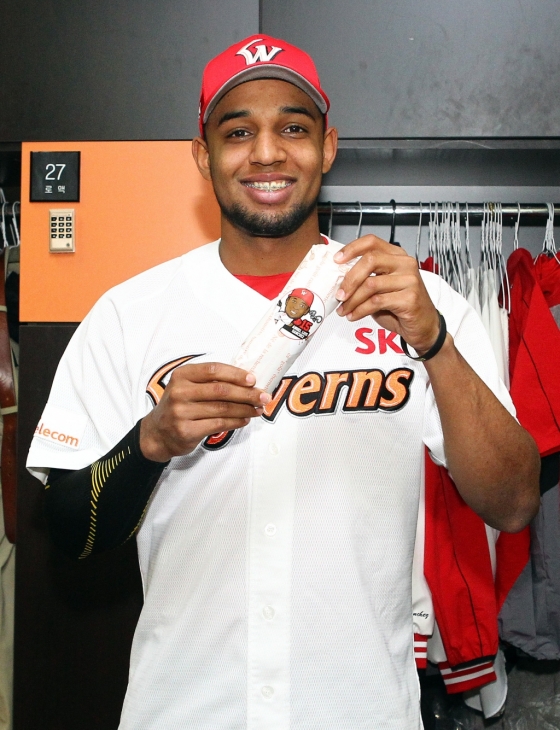 앙헬 산체스가 '산체스 브리또'를 들고 있다. /사진=SK 와이번스 제공