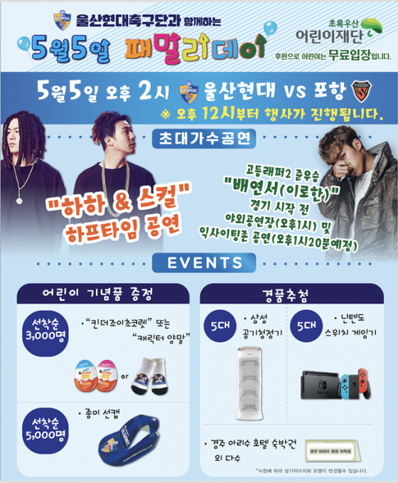 울산현대축구단이 어린이날인 5월 5일 오후 4시 문수축구경기장에서 열리는 포항과의 158번째 동해안더비를 맞이해 어린이들을 위한 다양한 이벤트를 연다.
