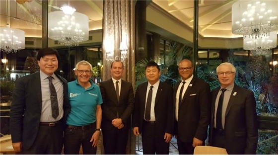 좌로부터 대한카누연맹 김은석 사무처장, 장 미셸 프로노 국제카누연맹 슬라럼위원장, 루도비크 로에 프랑스카누연맹 사무처장, 대한카누연맹 조현식 부회장, 프랑스카누연맹 장 종그라나회장, 안드레 아리베스 포(Pau)카누연맹 회장./ 사진제공=대한카누연맹