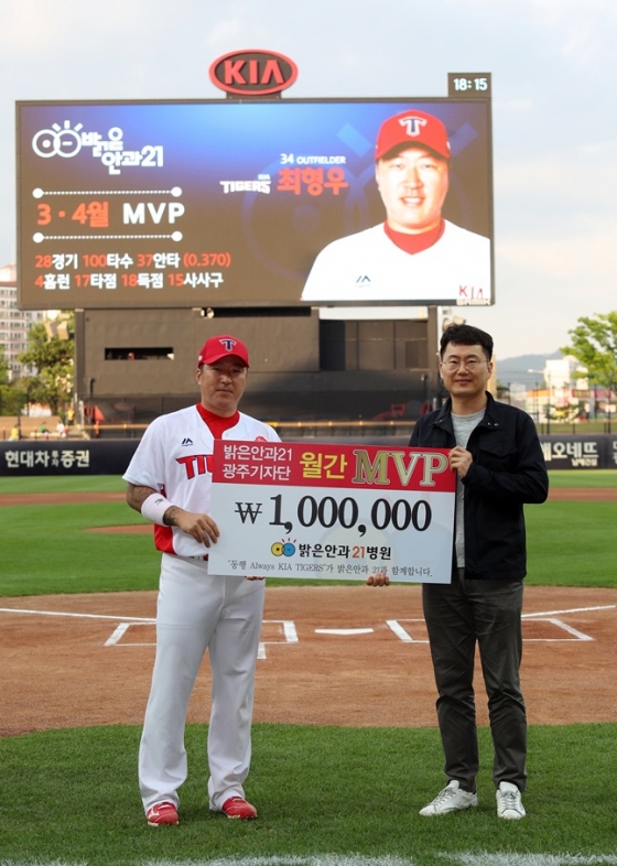 KIA 타이거즈 외야수 최형우(35)가 구단 지정병원인 밝은안과21병원이 시상하는 3·4월 월간 MVP에 선정돼 8일 광주 두산전에 앞서 시상식을 가졌다.