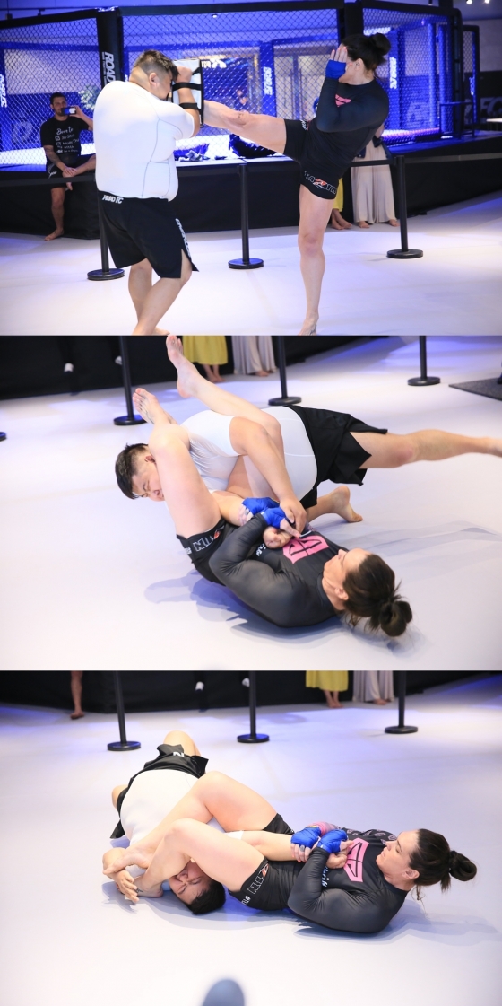 188cm 148kg의 거구 남자 파이터 아오르꺼러(23·중국)가 공개 훈련에서 역시 188cm 110kg의 탄탄한 신체조건의 여성 파이터 가비 가르시아(33·브라질)의 암바에 꼼짝 못하는 굴욕을 당했다.