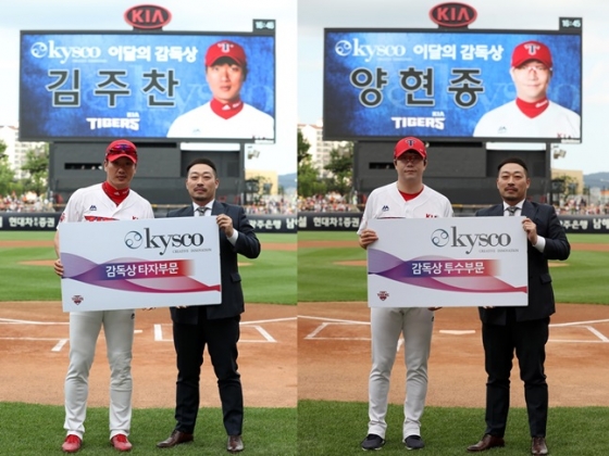 KIA 타이거즈 투수 양현종(30)과 내야수 김주찬(37)이 구단 후원업체인 Kysco(키스코)가 시상하는 3·4월 '이달의 감독상'에 선정돼 19일 광주 SK전에 앞서 시상식을 가졌다.