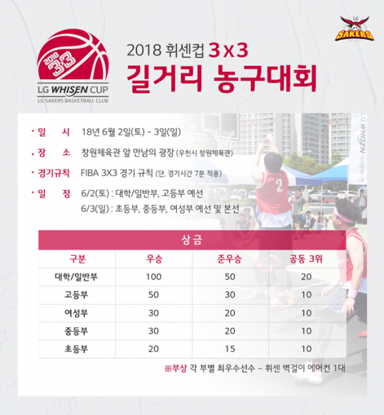 창원 LG세이커스가 오는 2일~3일 양일 간 창원체육관 앞 만남의 광장에서 제18회 LG휘센컵 3X3 농구대회를 개최한다고 1일 밝혔다.